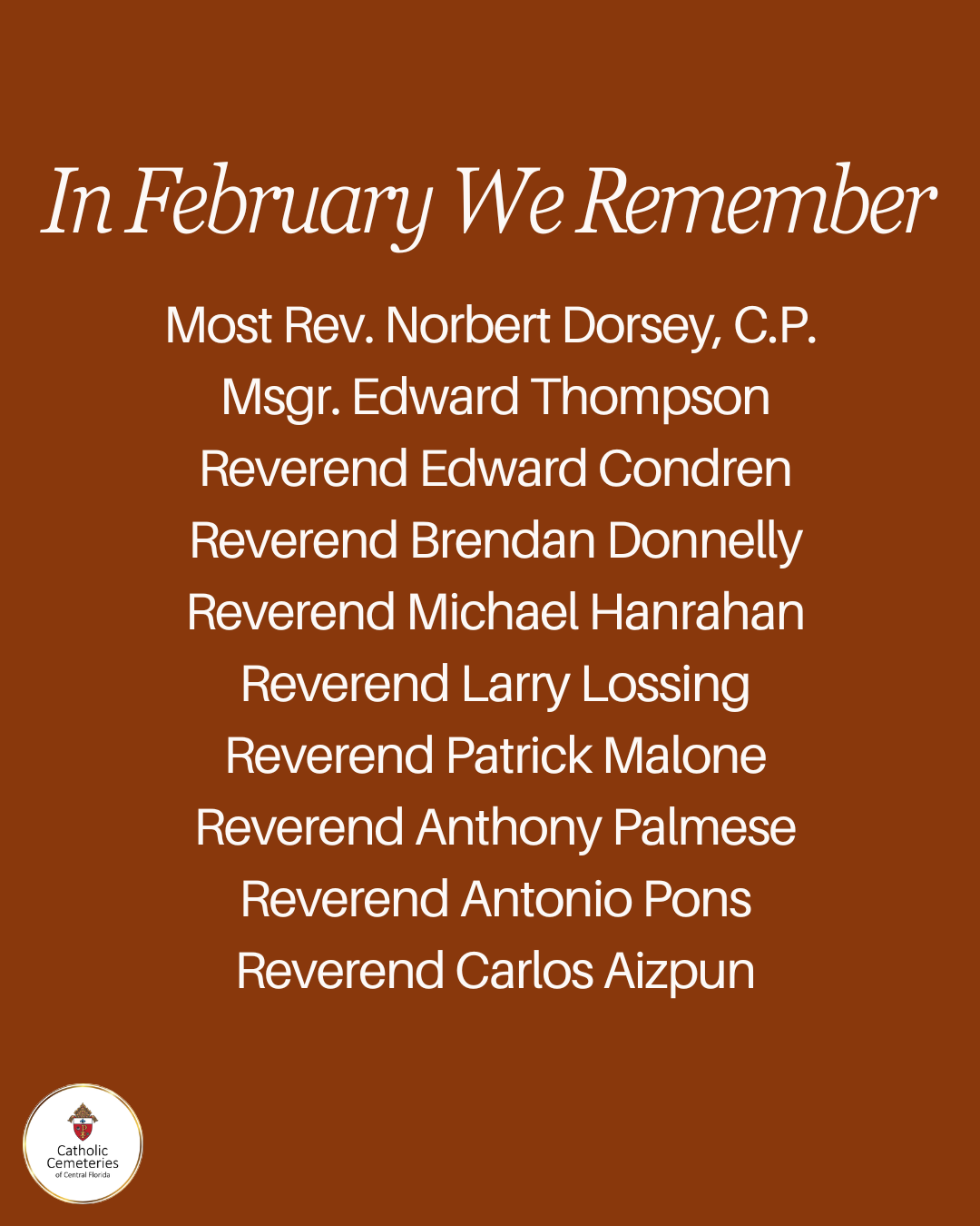 We invite you to join us for the monthly Mass of Remembrance for deceased Priests and Deacons of the Diocese of Orlando.